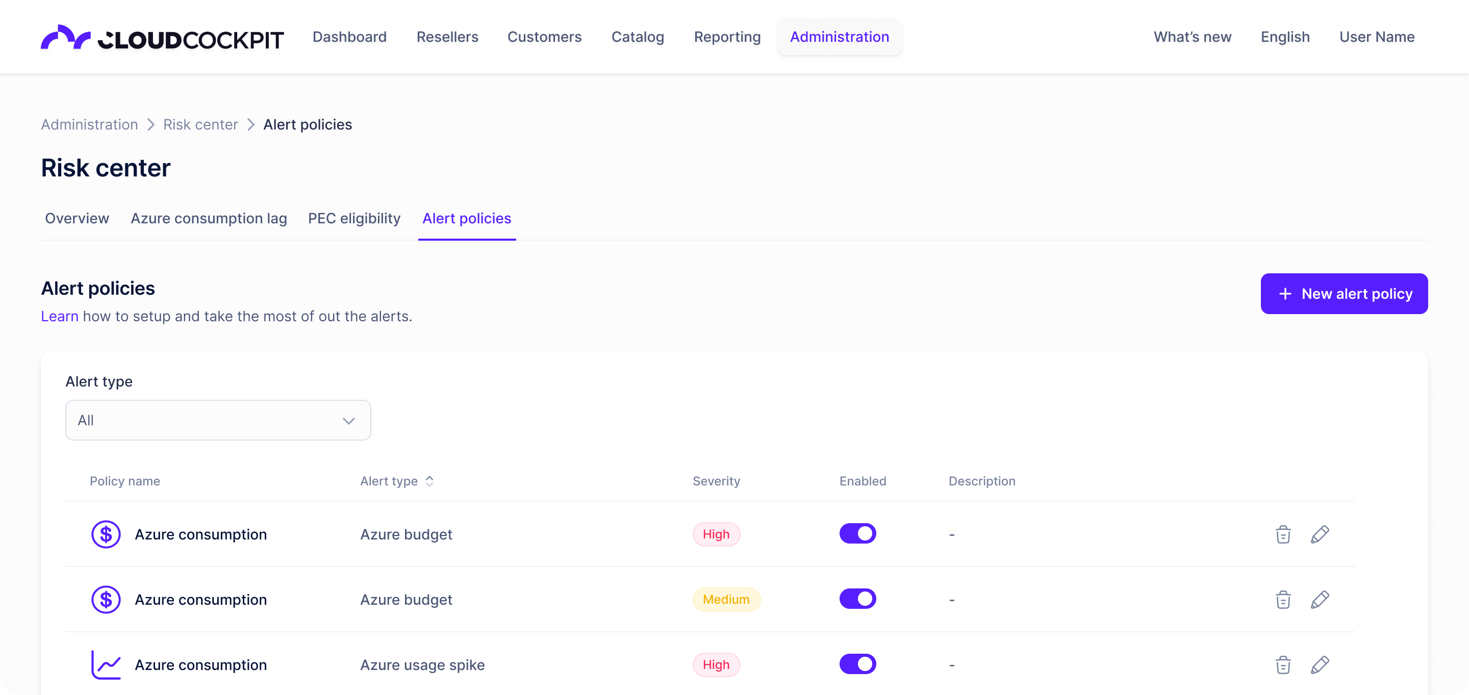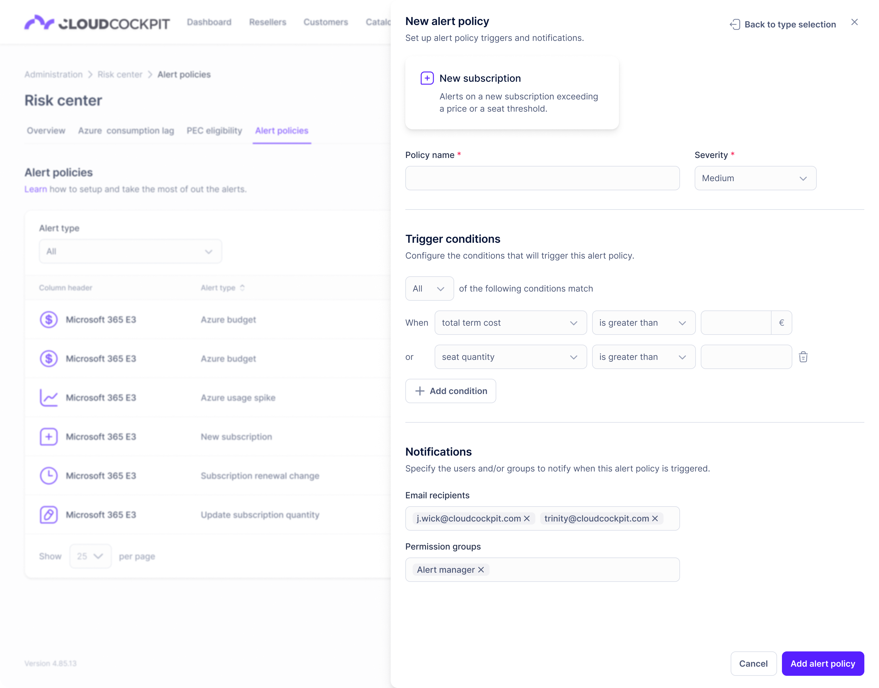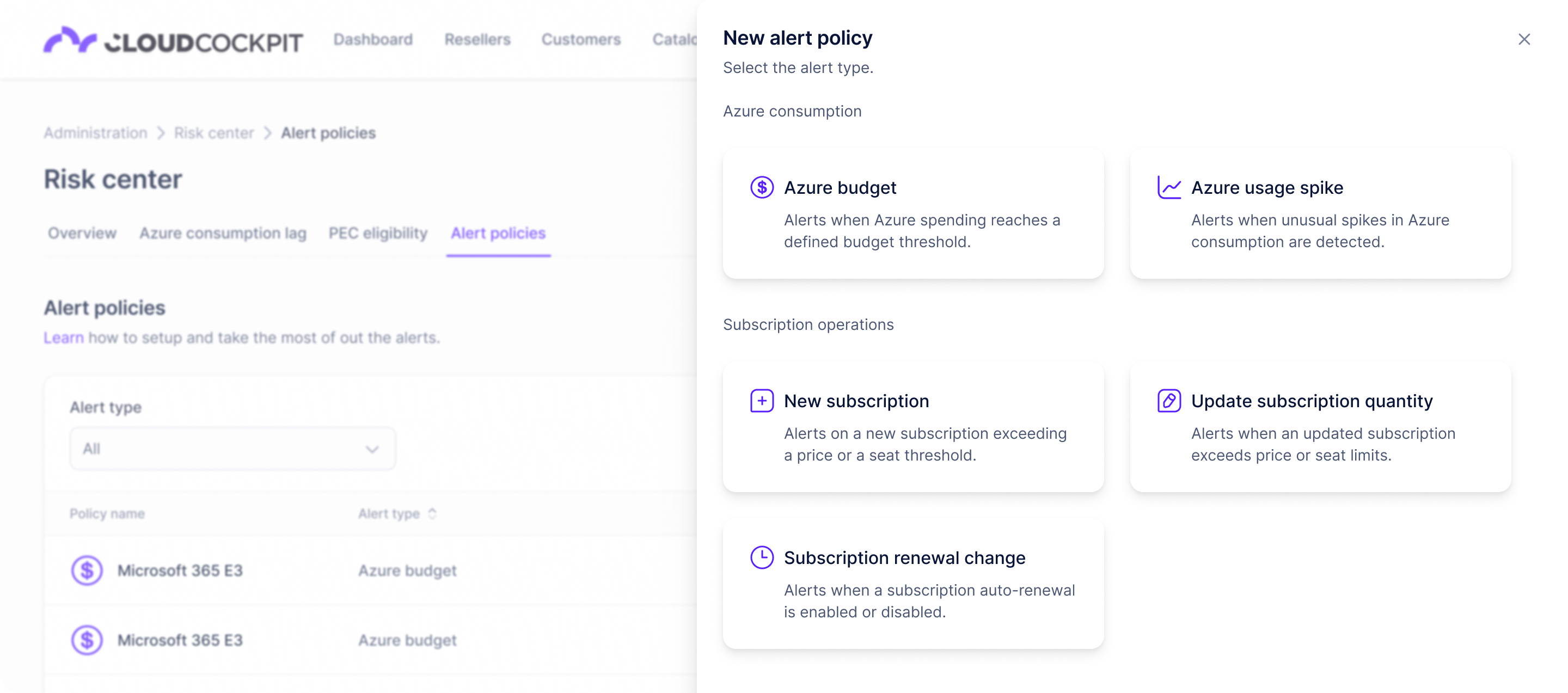Alert policies help you detect budget overruns, unusual consumption spikes, unauthorized subscription changes and more, before they impact your business.