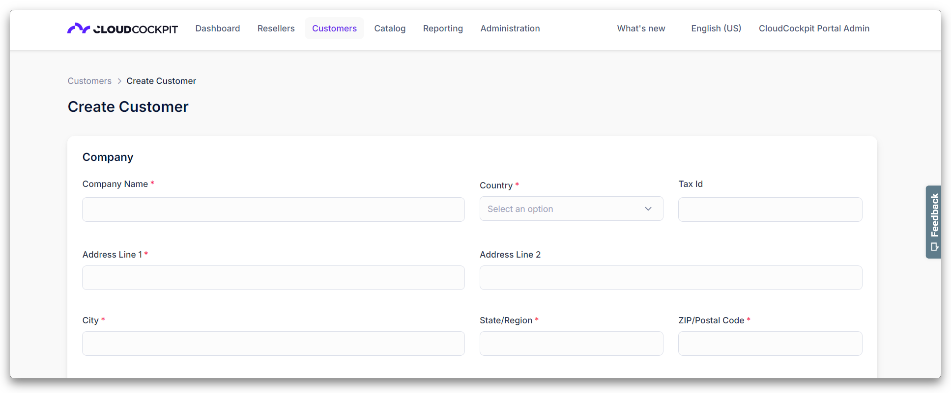 Follow these steps to create a new Customer account in CloudCockpit, which will then be automatically created also in Microsoft Partner Center.