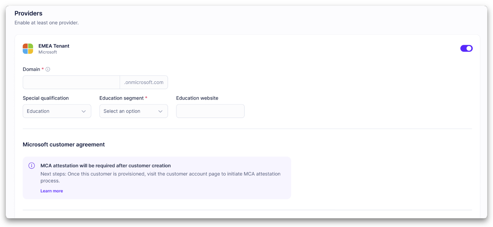 Customers must accept the Microsoft Customer Agreement (MCA) before any Microsoft services can be activated or managed.